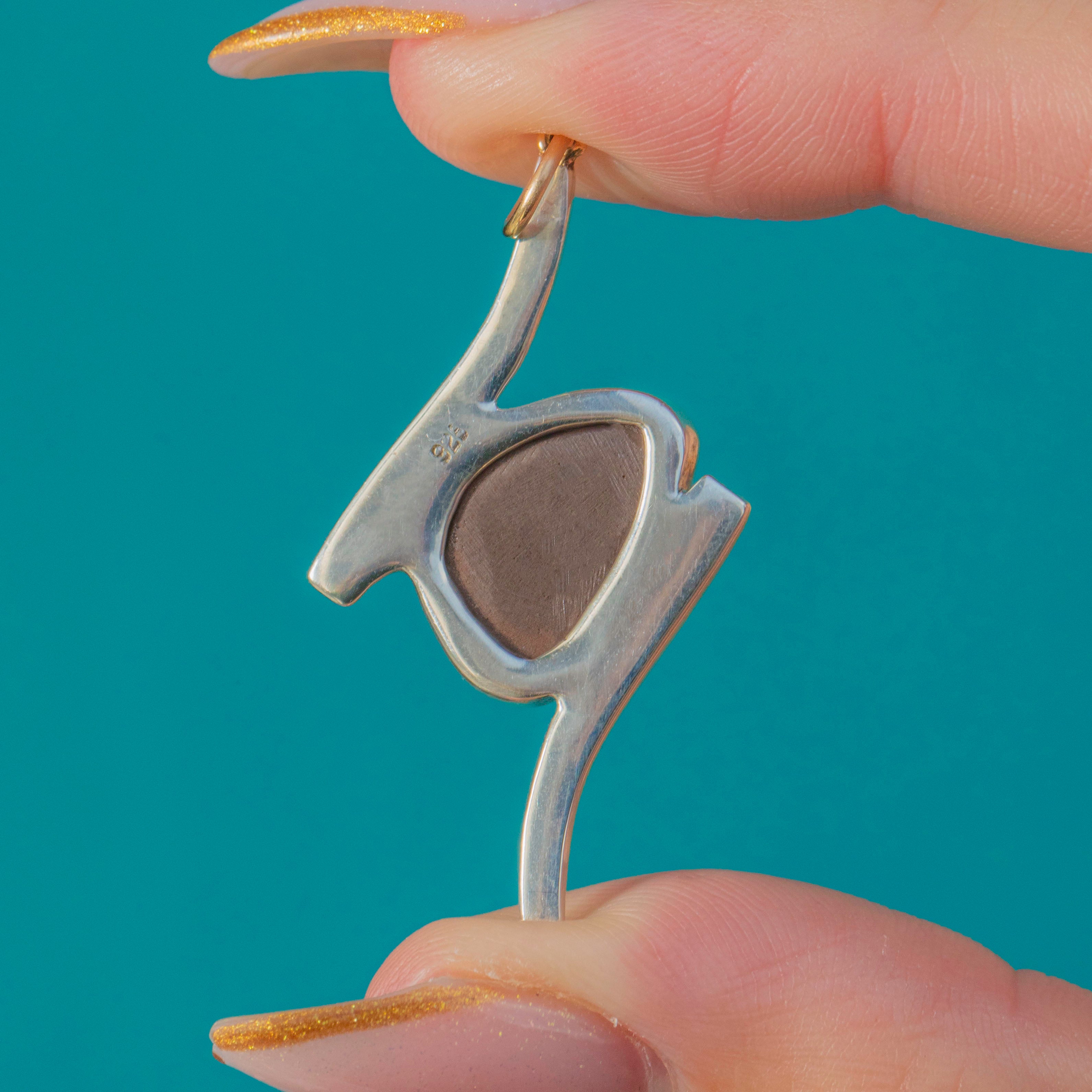 This Vintage Silver Australian Opal doublet pendant has a striking, modernist feel. The Opal doublet is bezel-set on the diagonal, with sweeping Silver curves framing the stone in an open, sculptural design.