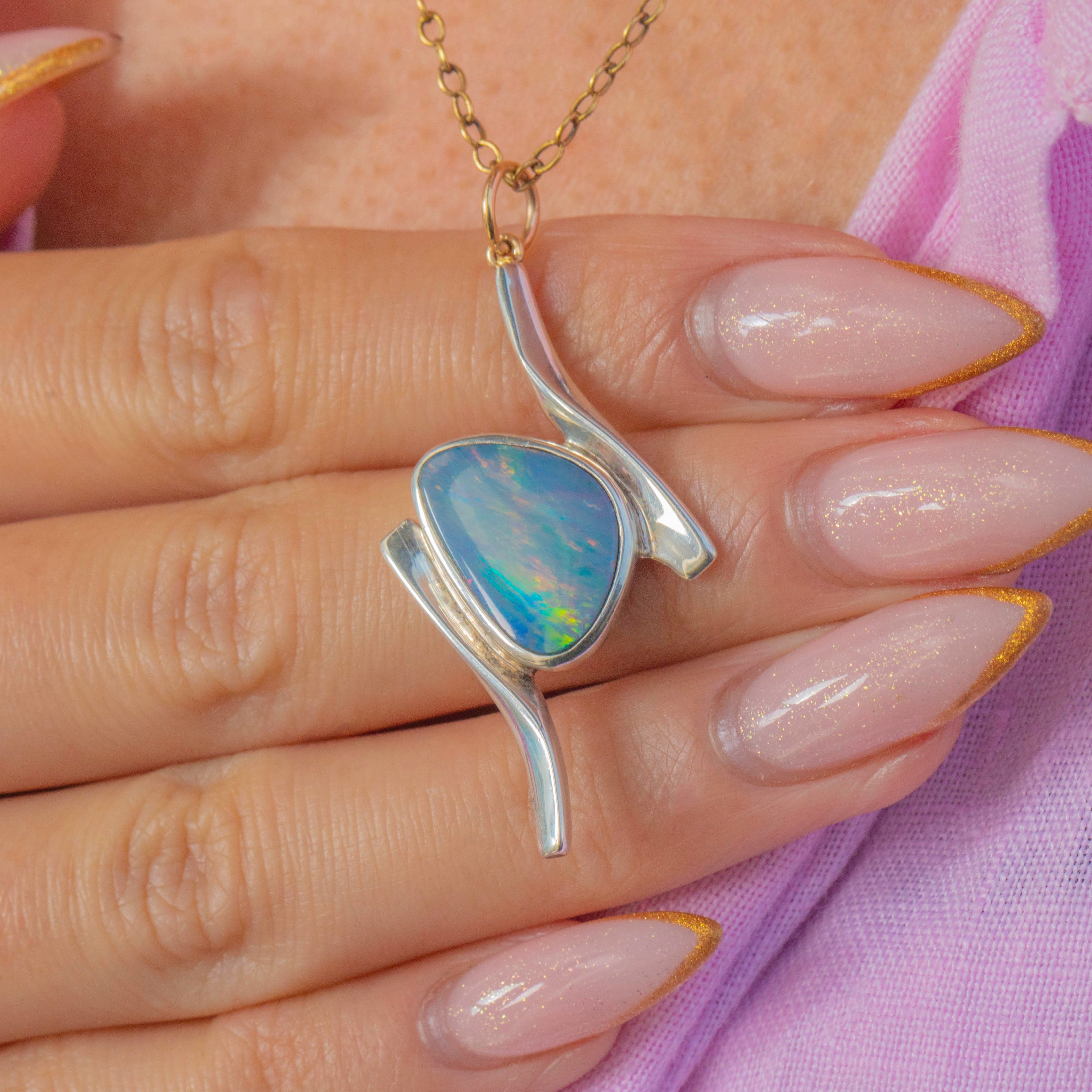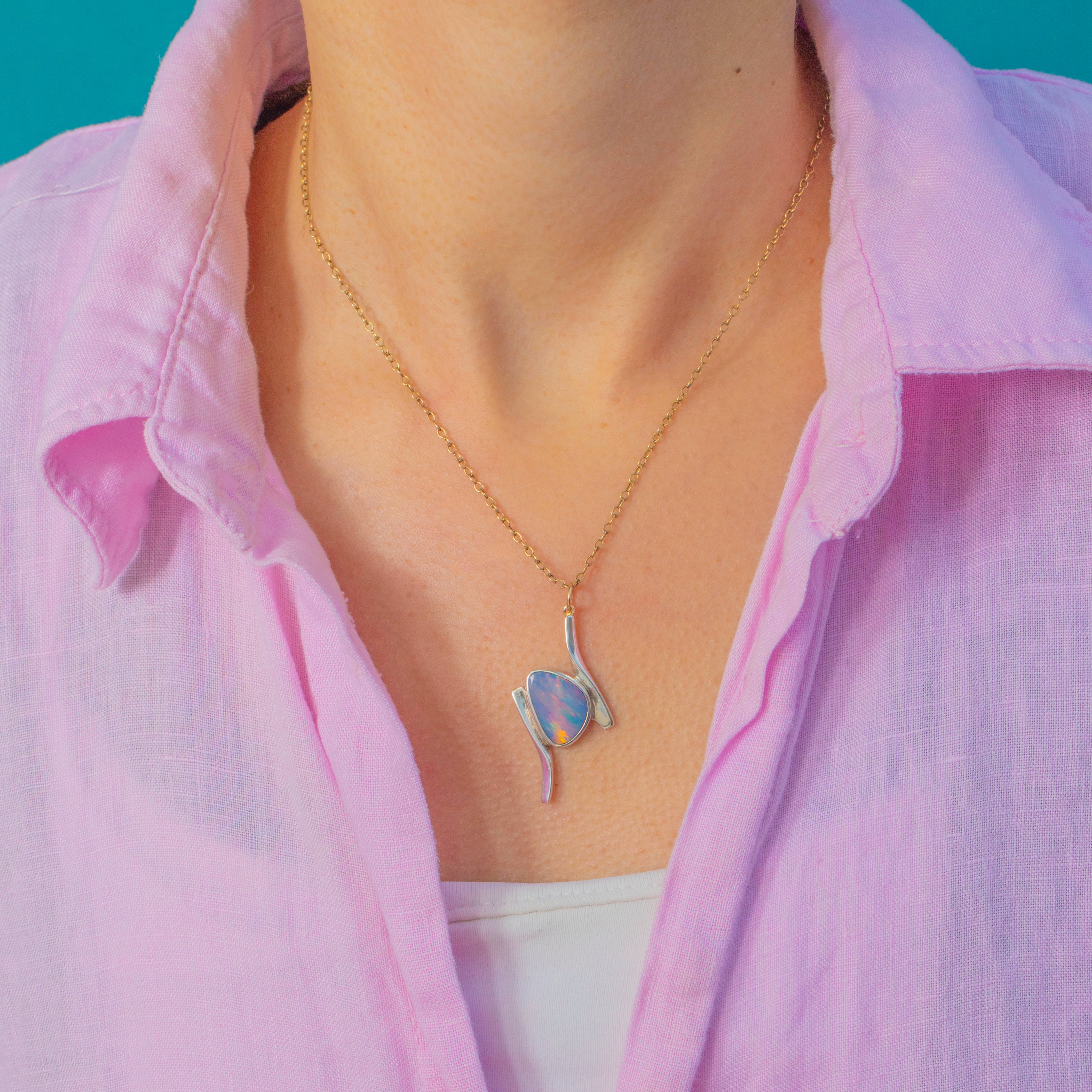 The Australian Opal doublet displays attractive play of colour against its blue ground, with flashes that catch the light beautifully as the pendant moves. A sleek and wearable piece that adds a pop of colour and character to any chain.