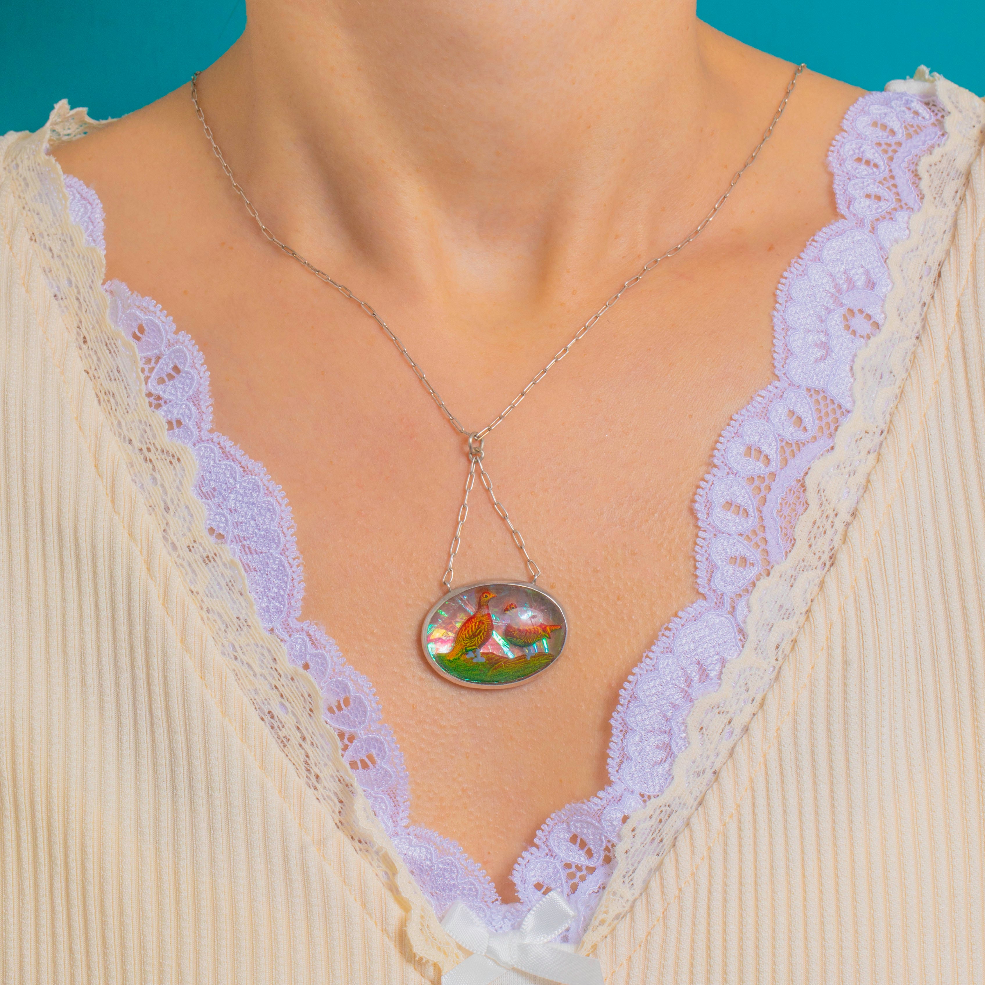Vintage Silver Reverse Painted Pheasant Family Pendant Necklace