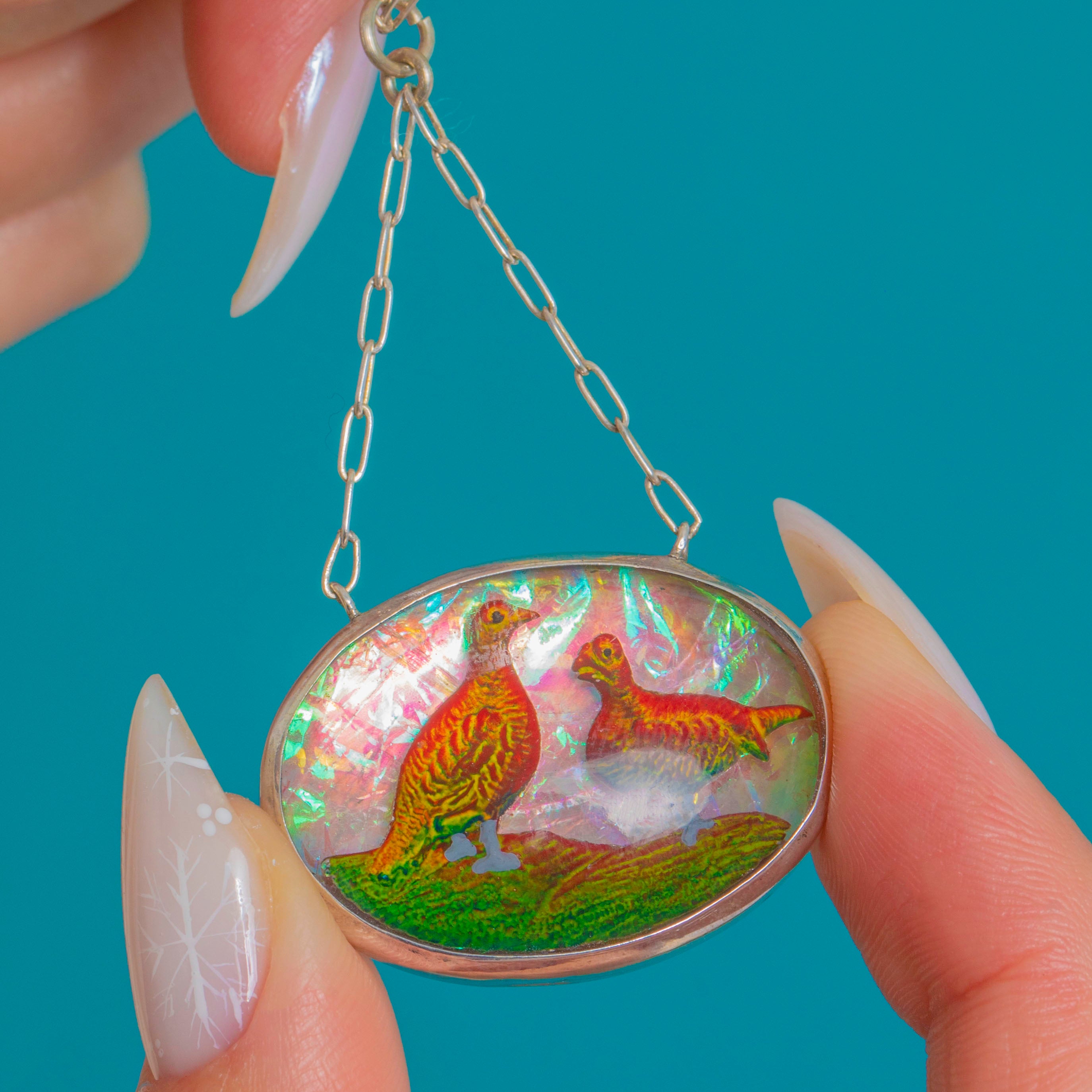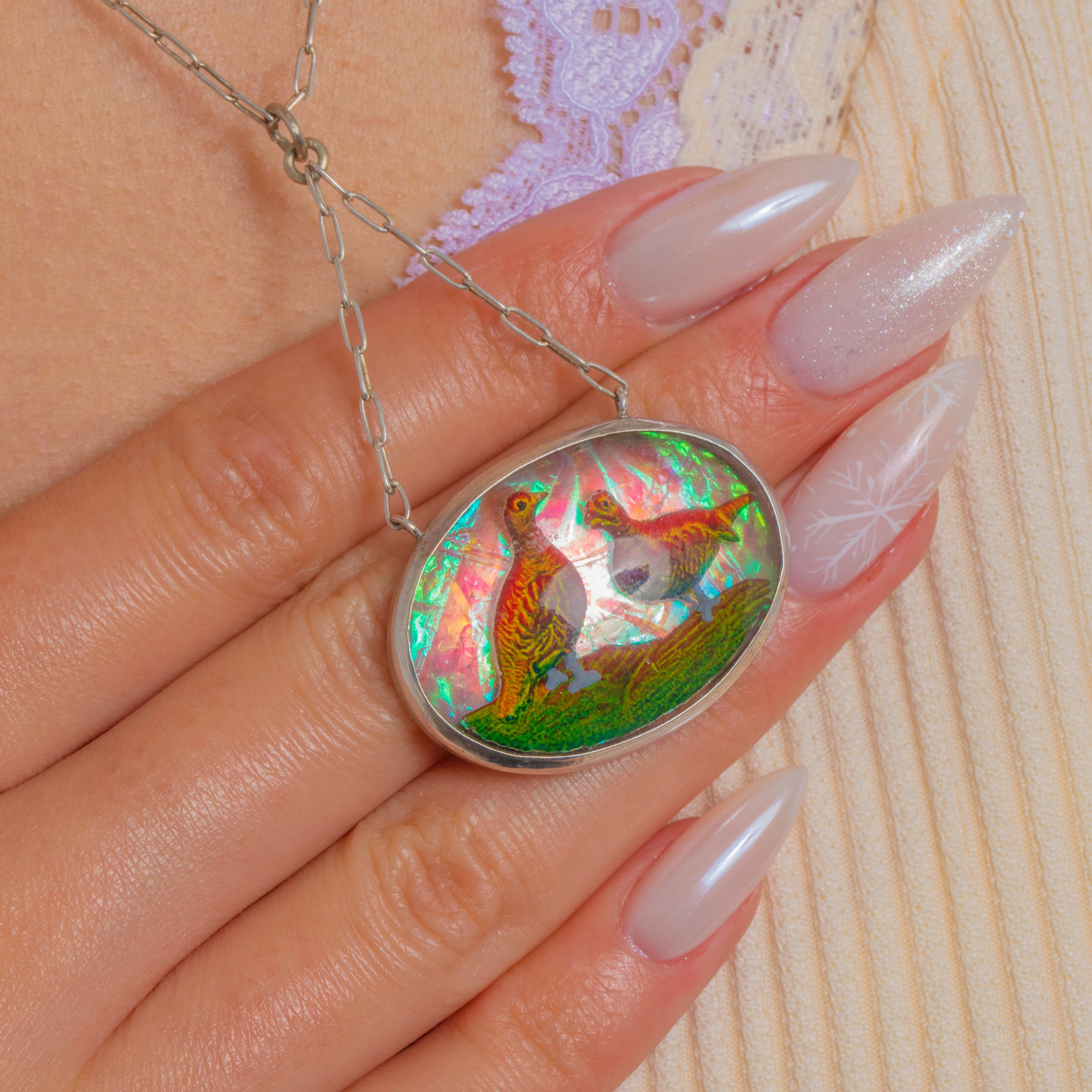 A cheerful burst of colour and craftsmanship, this Vintage Silver pendant necklace showcases a reverse carved and painted resin dome that brings two vivid birds and verdant foliage to life against an iridescent backdrop. The oval cabochon is framed by a simple closed-back Silver bezel with twin side loops, creating a refined silhouette that lets the scene sing.