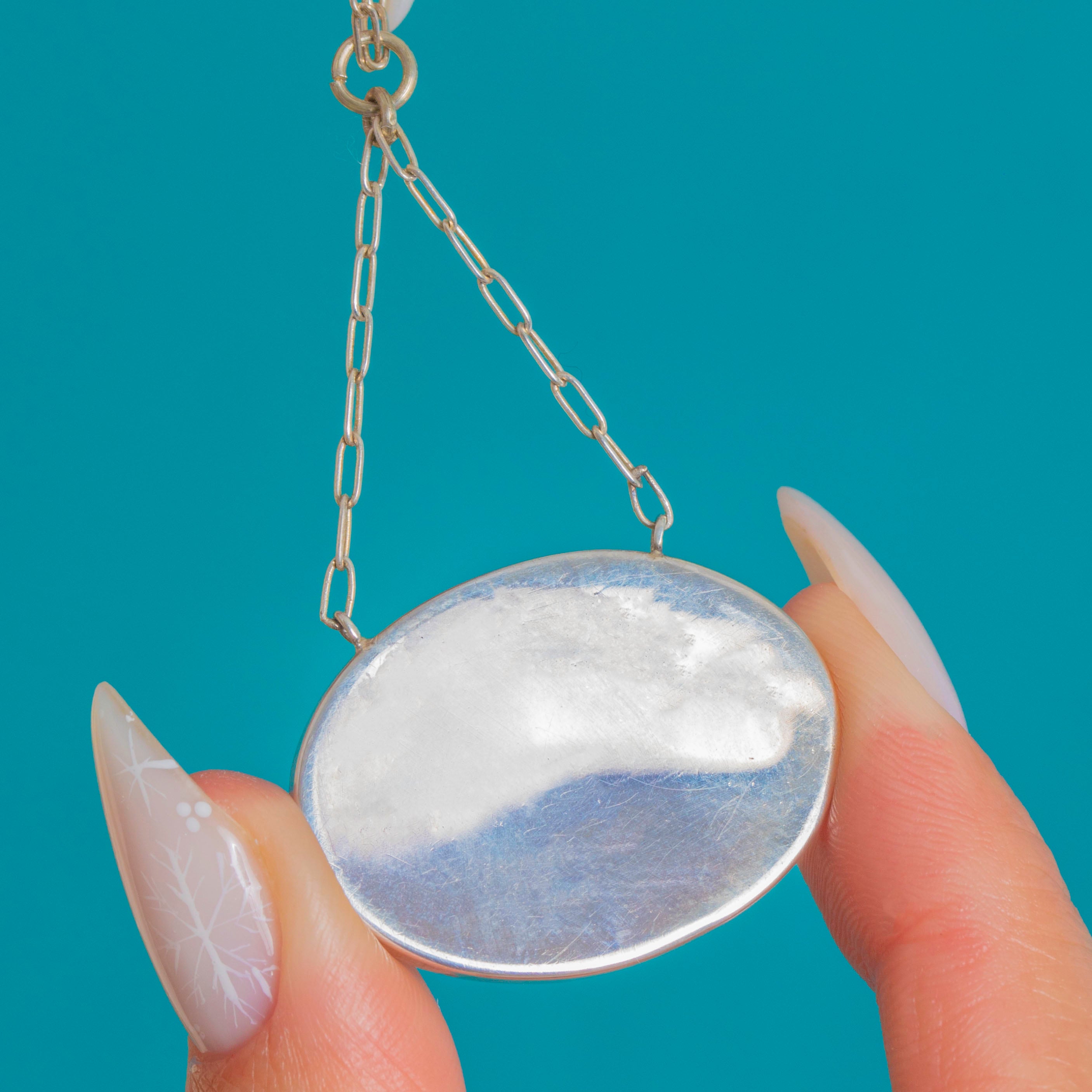 VERY GOOD: The clear Resin dome shows light surface abrasions under magnification with no chips or cracks observed, and the painted scene remains crisp and vibrant. The Silver bezel, fittings, and chain display minor patina and surface wear commensurate with age, all secure and ready to wear. No visible repairs or alterations.