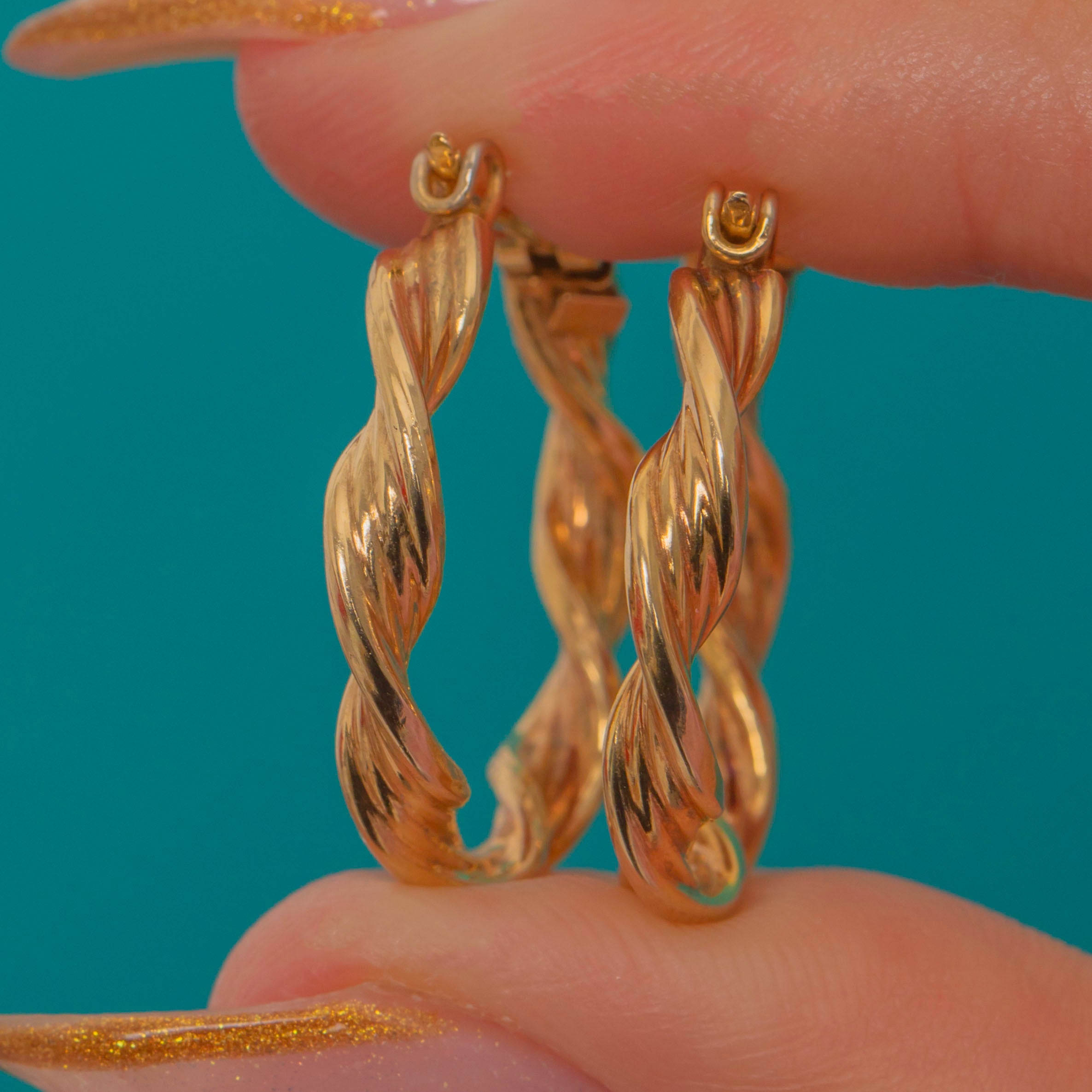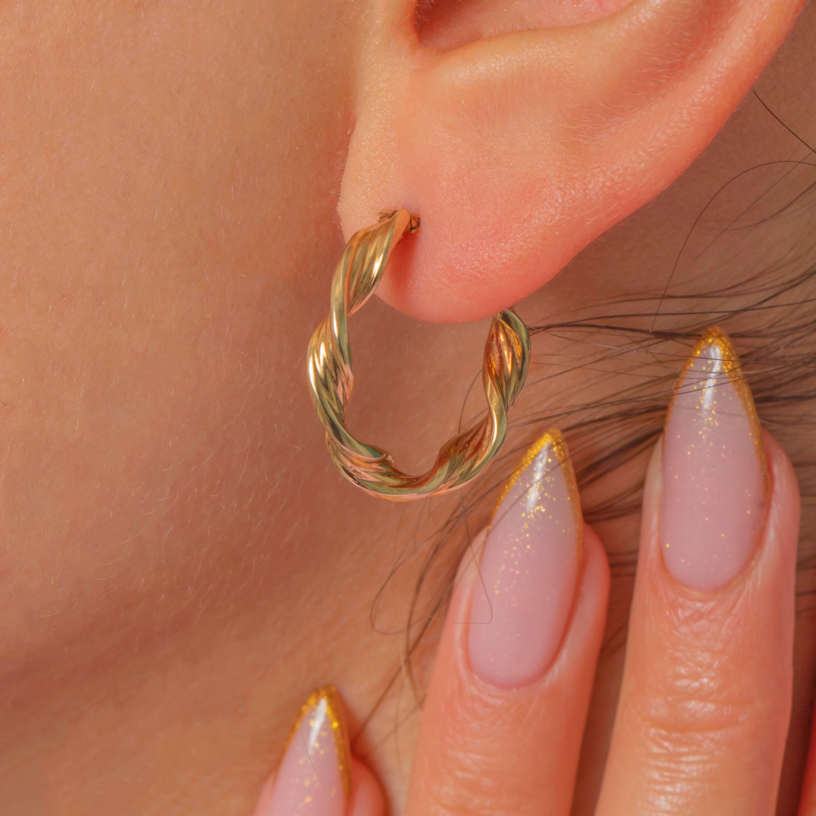 EXCELLENT: These Vintage hoop earrings are in outstanding condition with bright, glossy Gold throughout. The twist design is crisp, the surface highly polished, and the fittings close securely. Beautifully made and ready to wear.