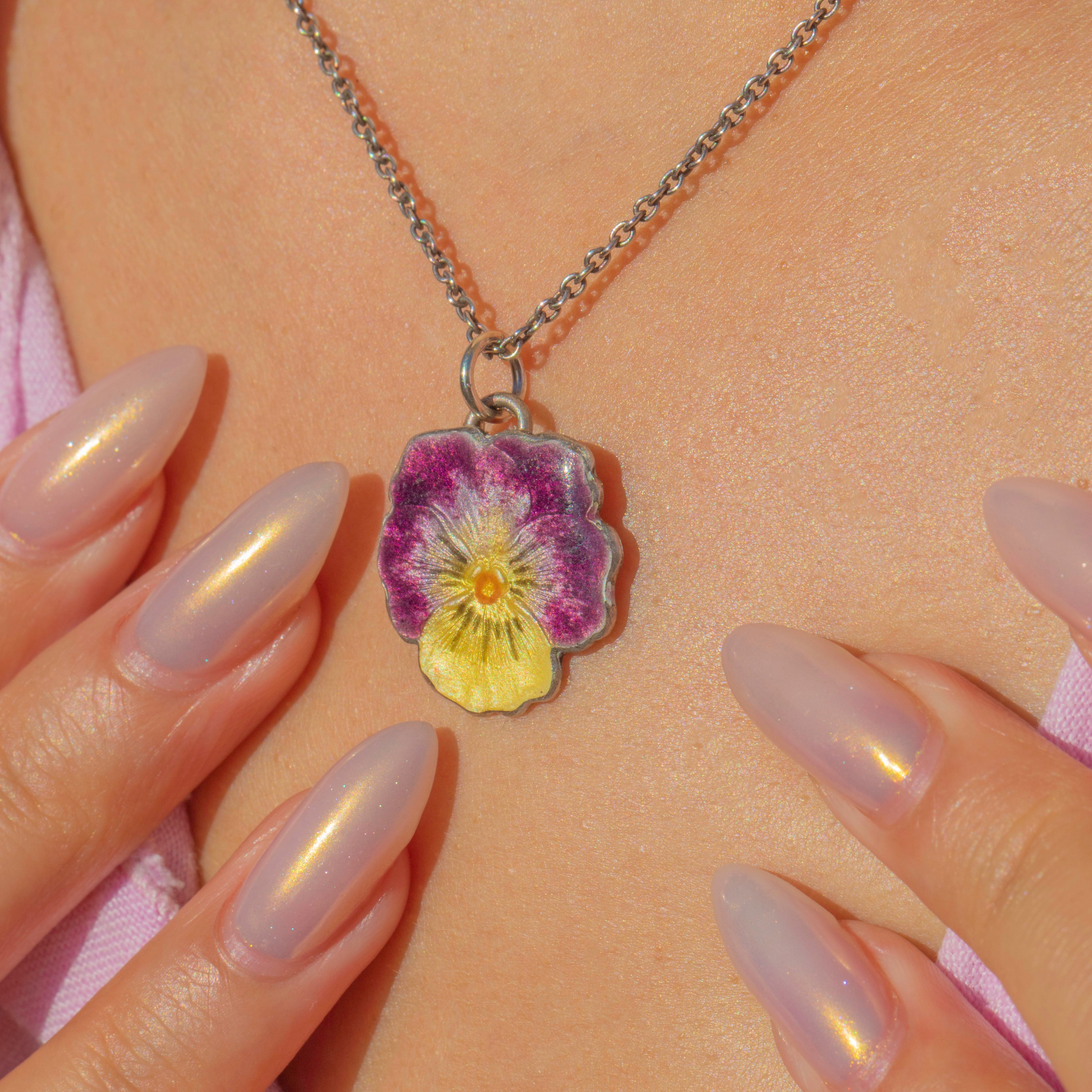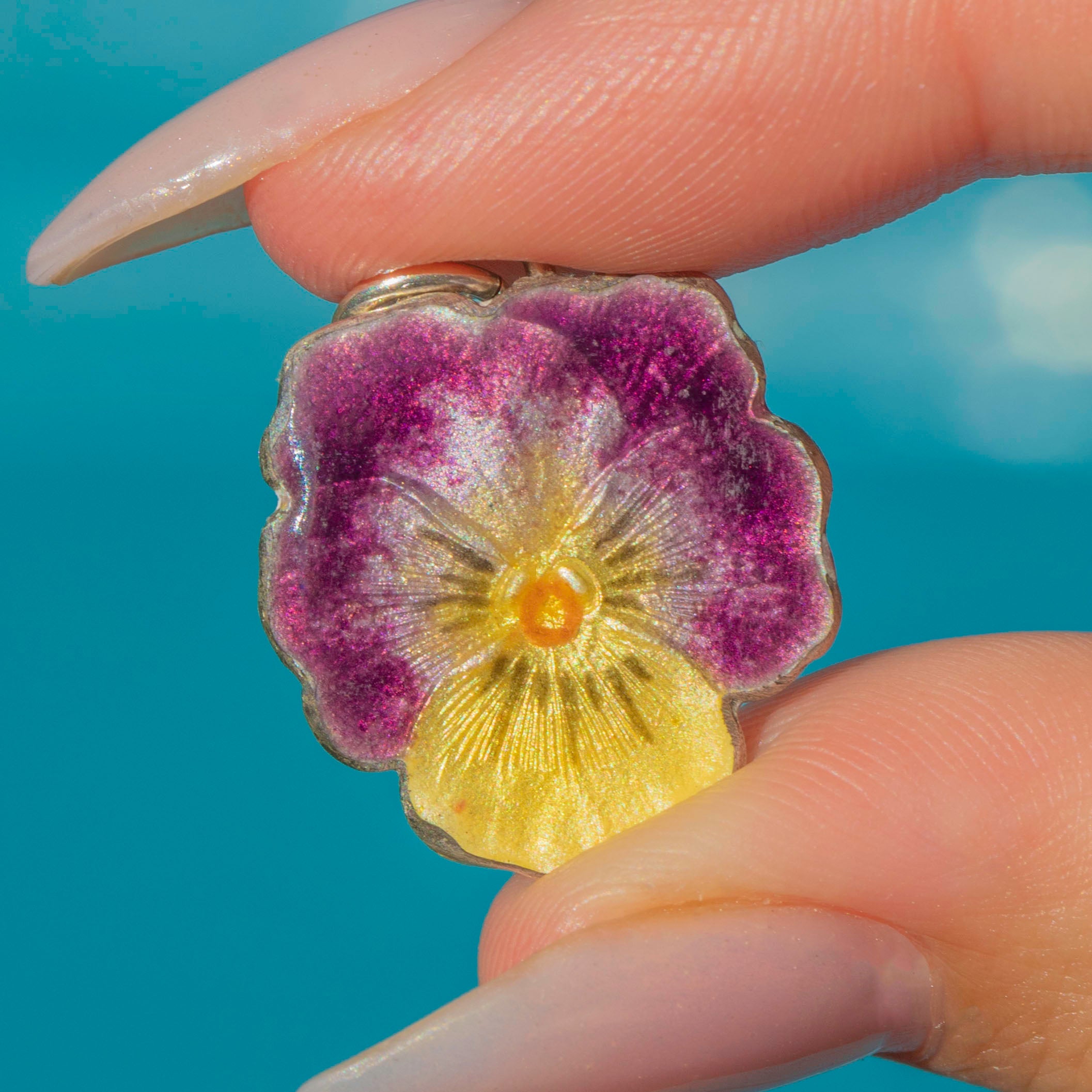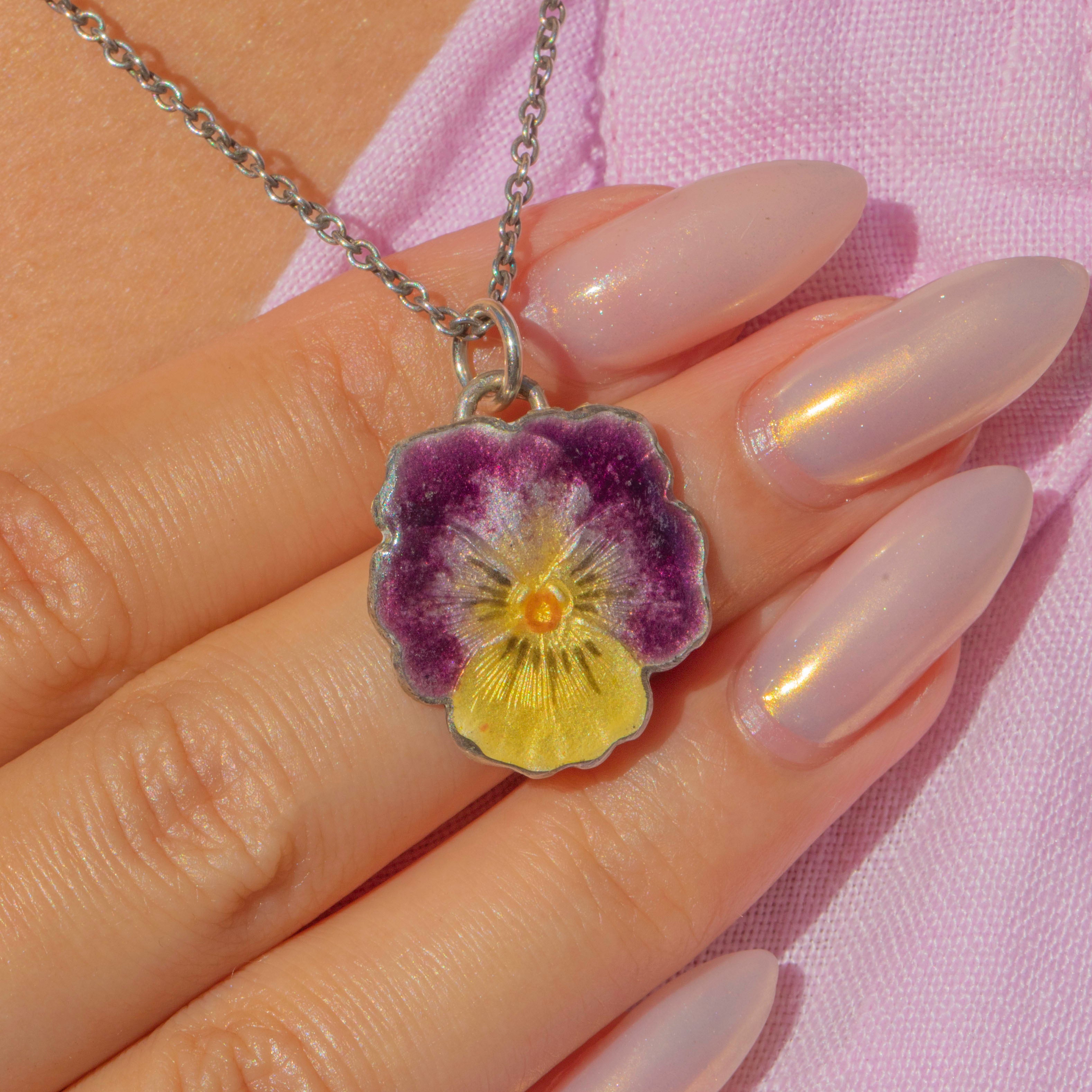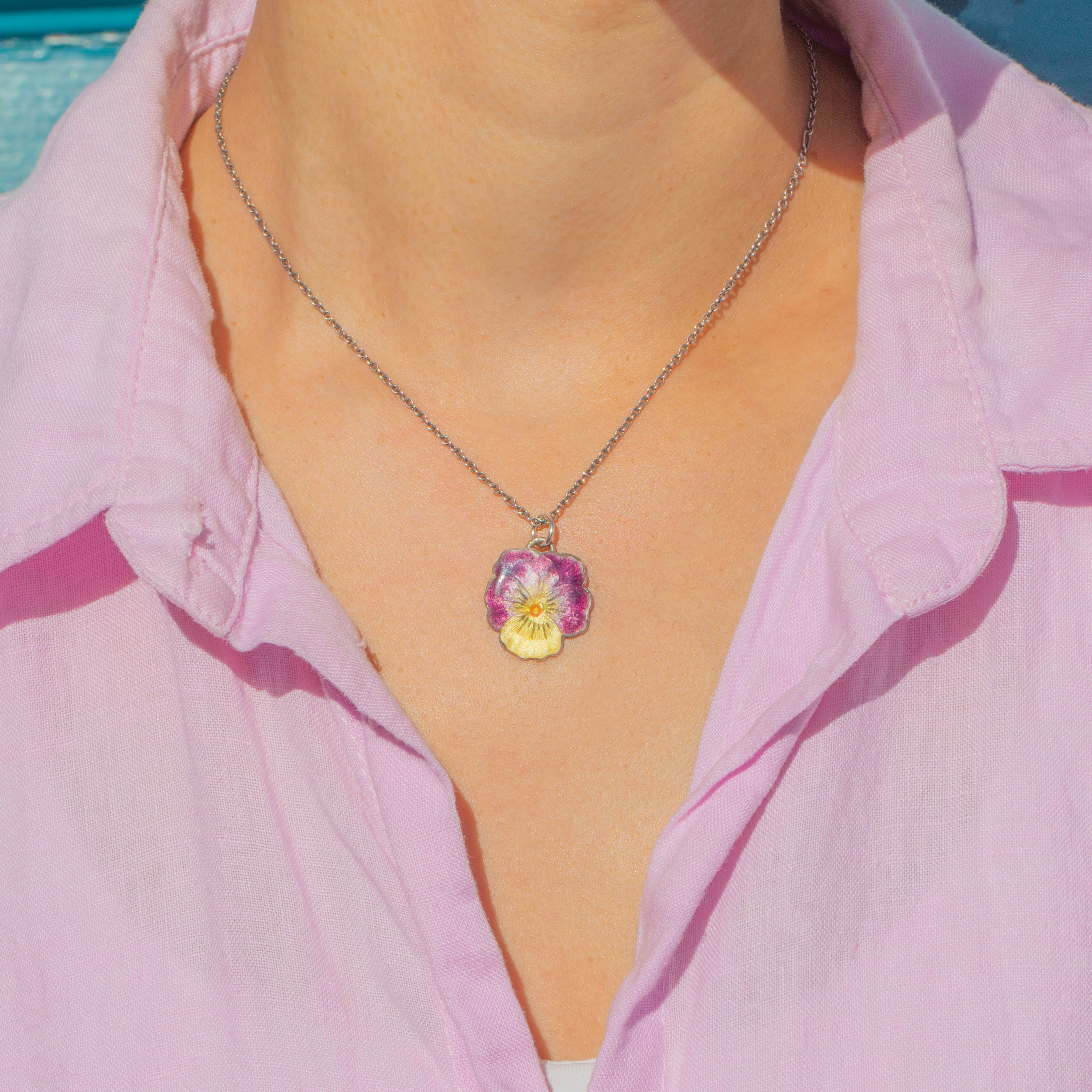 A charming mid-century Sterling Silver pansy flower charm dating to the 1950s. The enamel work is beautifully executed in purple, lavender, and yellow, with a soft iridescent sheen that catches the light wonderfully. The pansy has long symbolised remembrance, thoughtfulness, and enduring affection, making this a sentimental and collectable jewel.