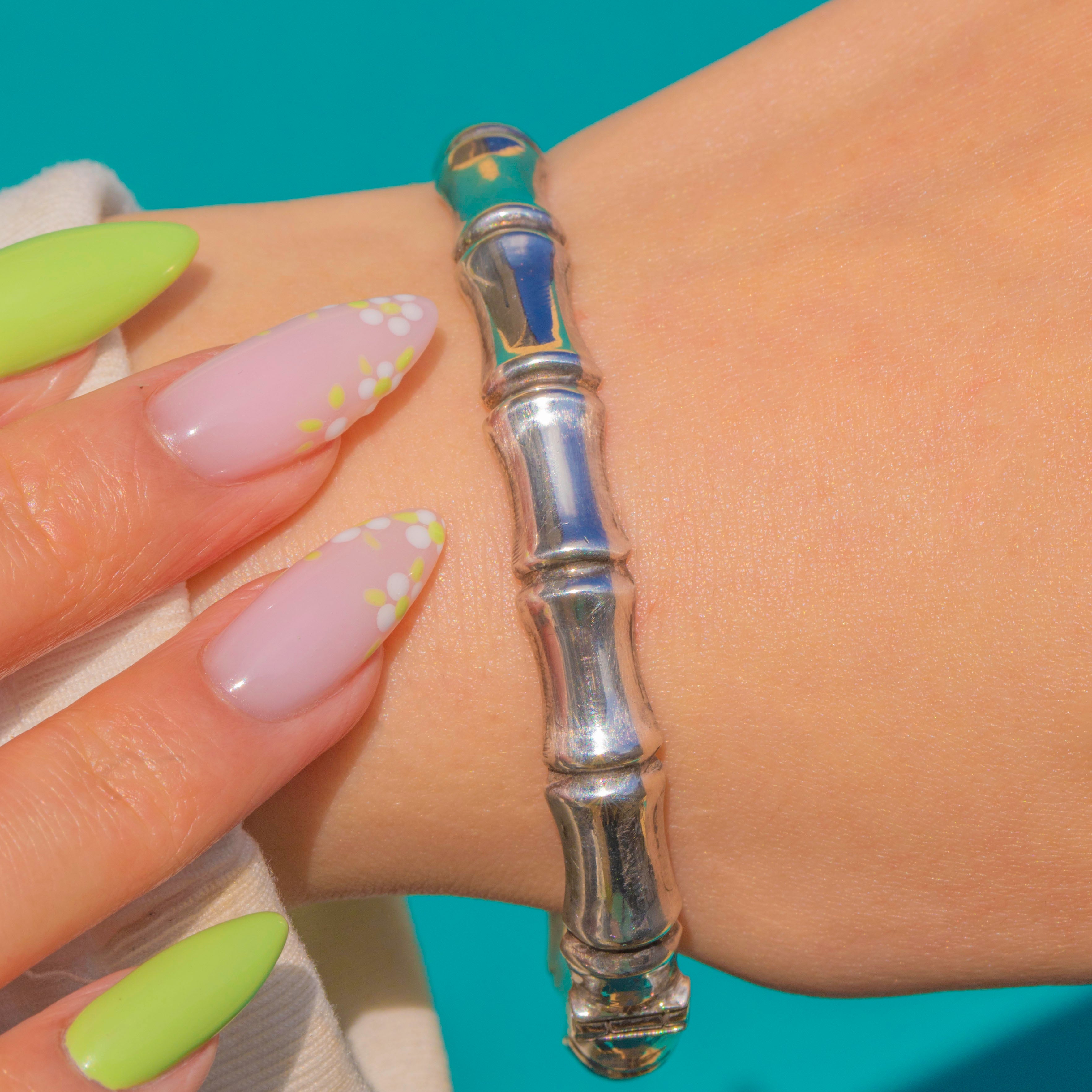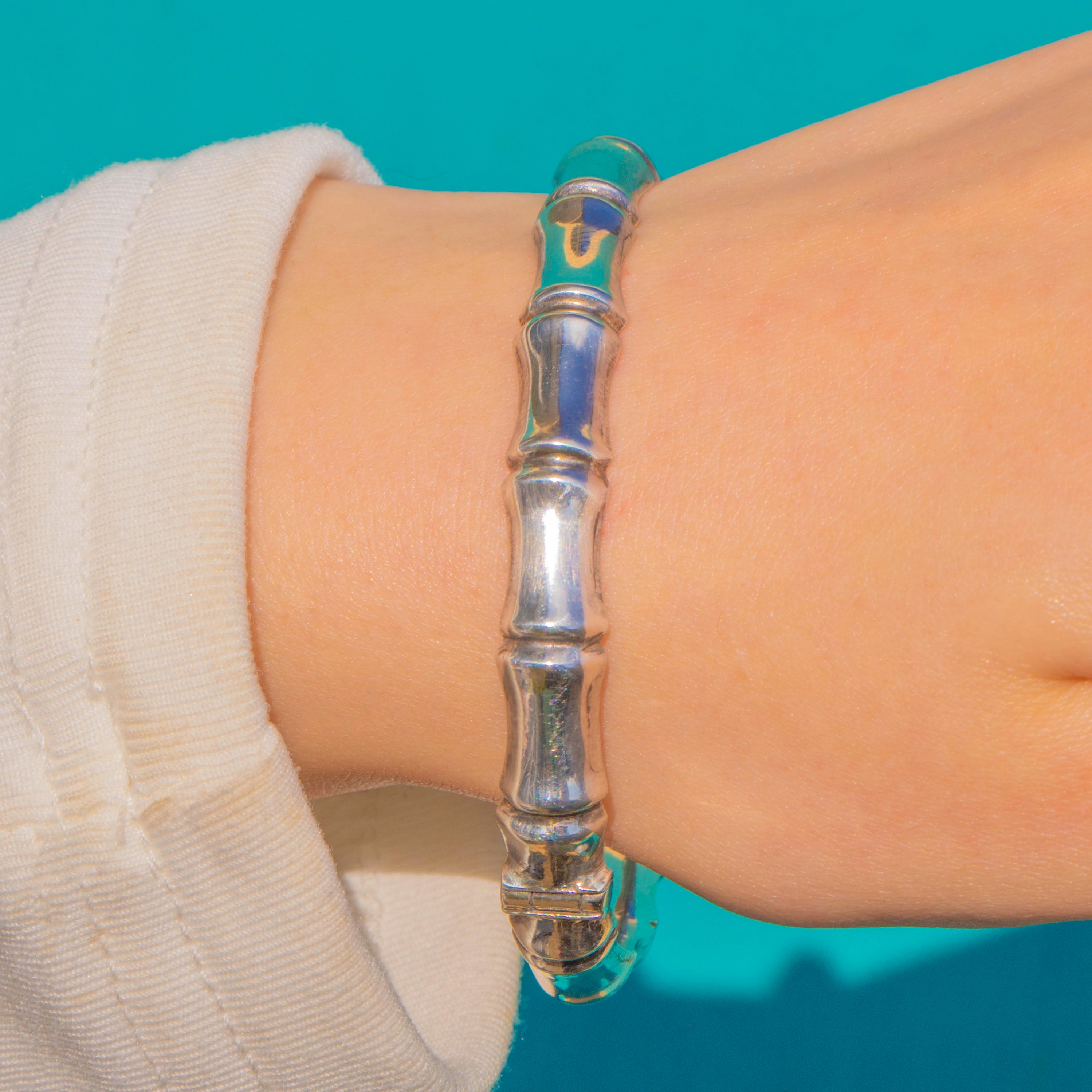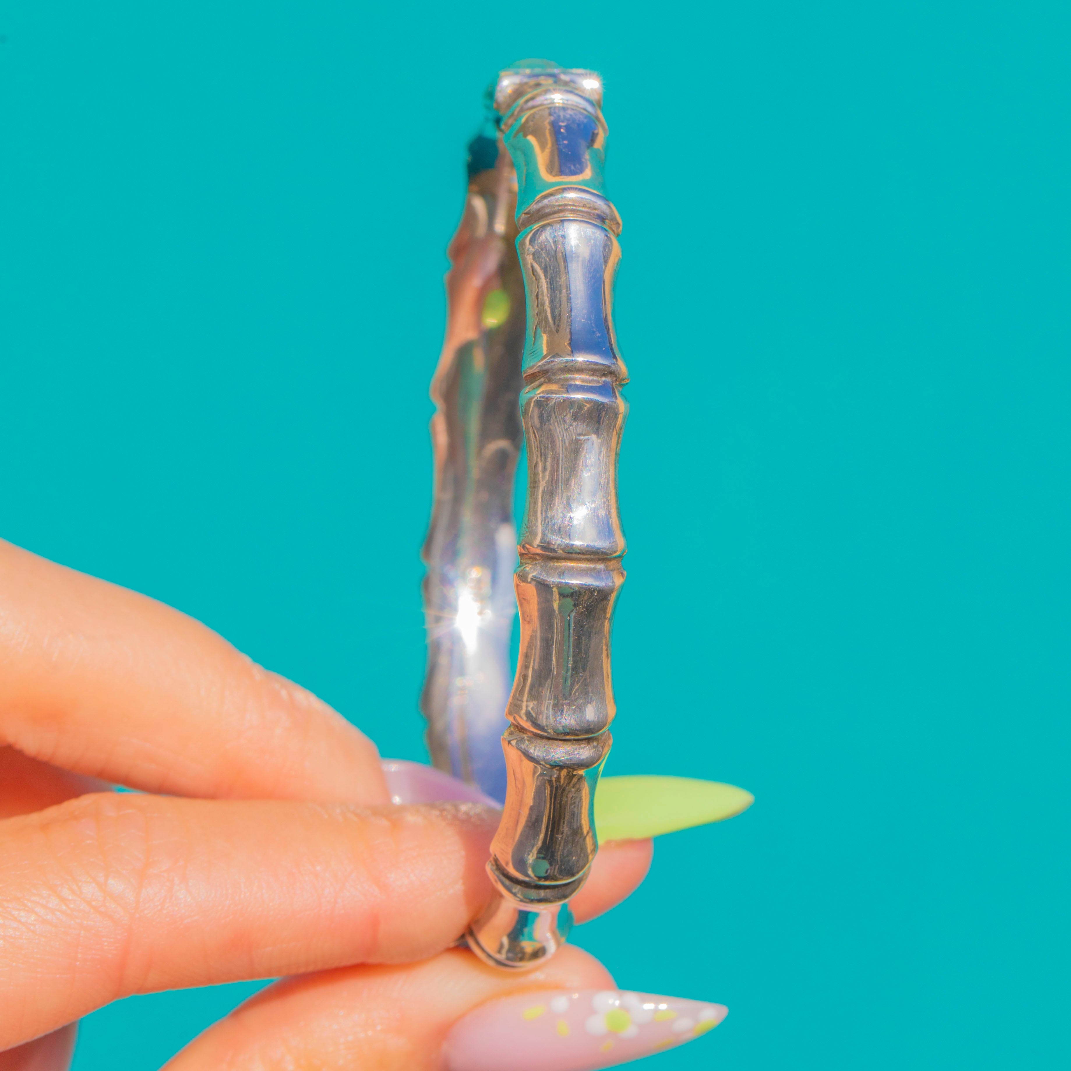 Evoking the serene elegance of bamboo, this Vintage Sterling Silver bangle is sculpted in repeating, rounded nodes with smooth internodes for a bold, organic silhouette. Its bright, high-polish finish accentuates the sculptural lines, creating a piece that feels both timeless and modern.