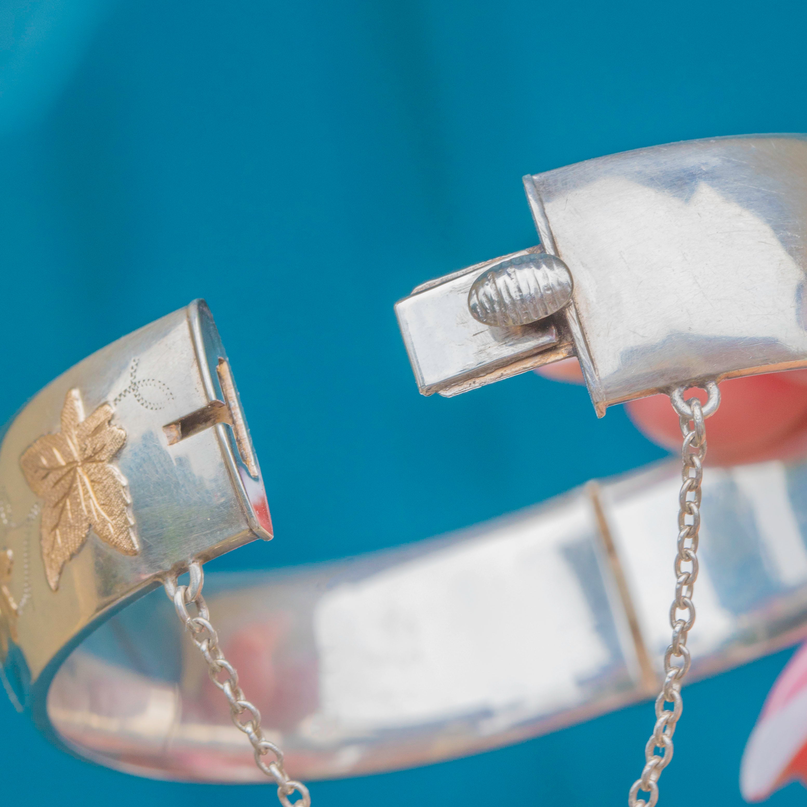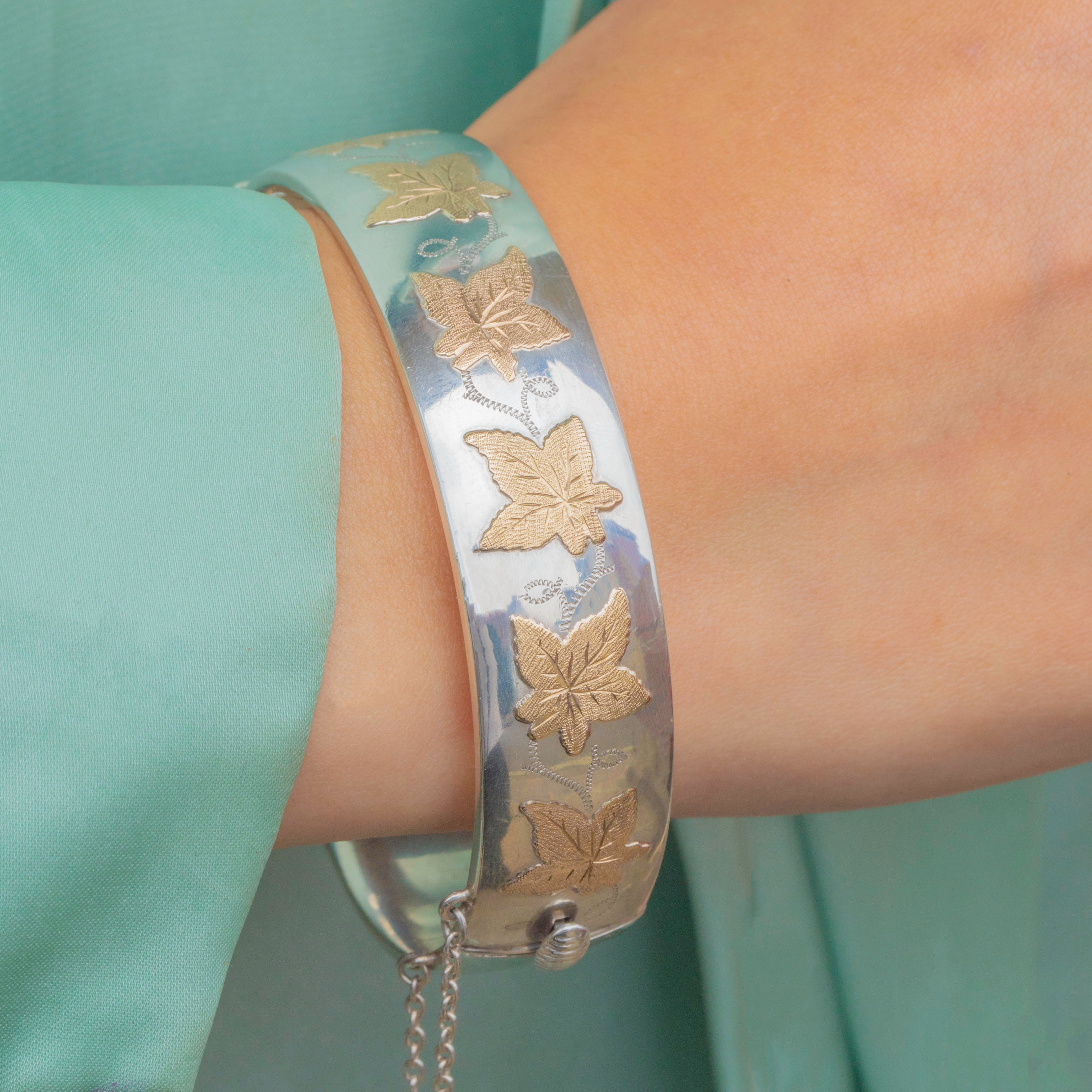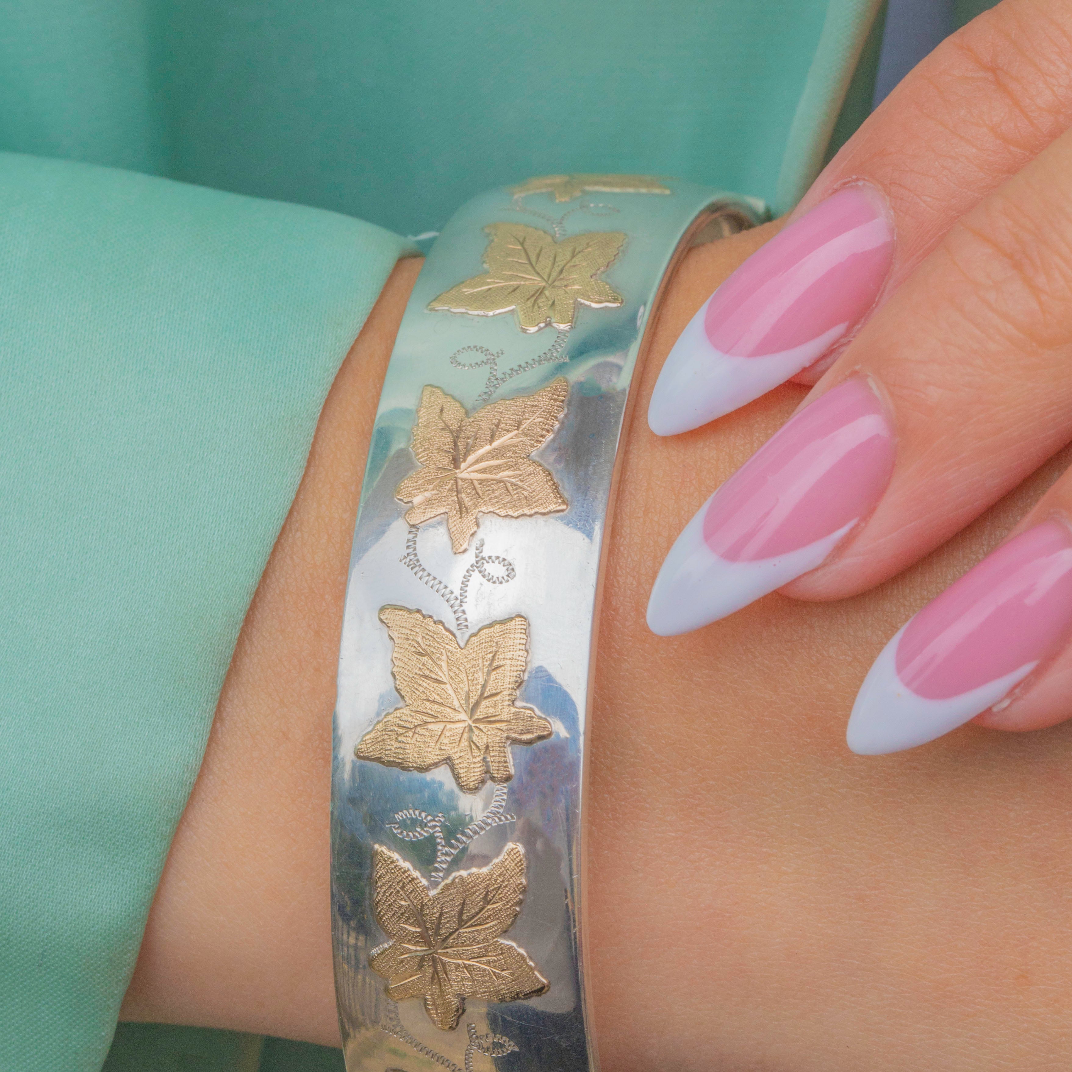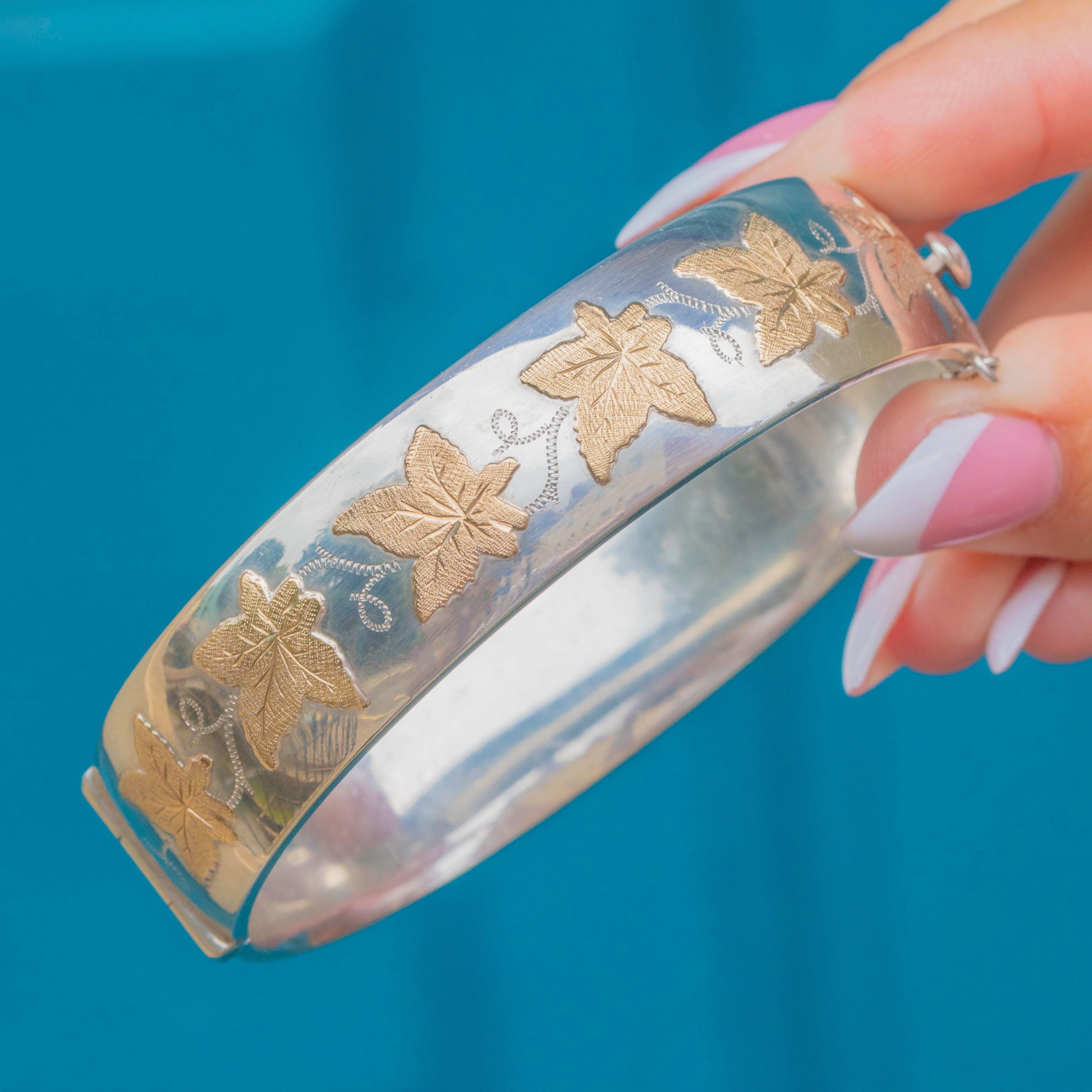 Vintage Sterling Silver Bangle with 9ct Gold Ivy Leaf Motifs