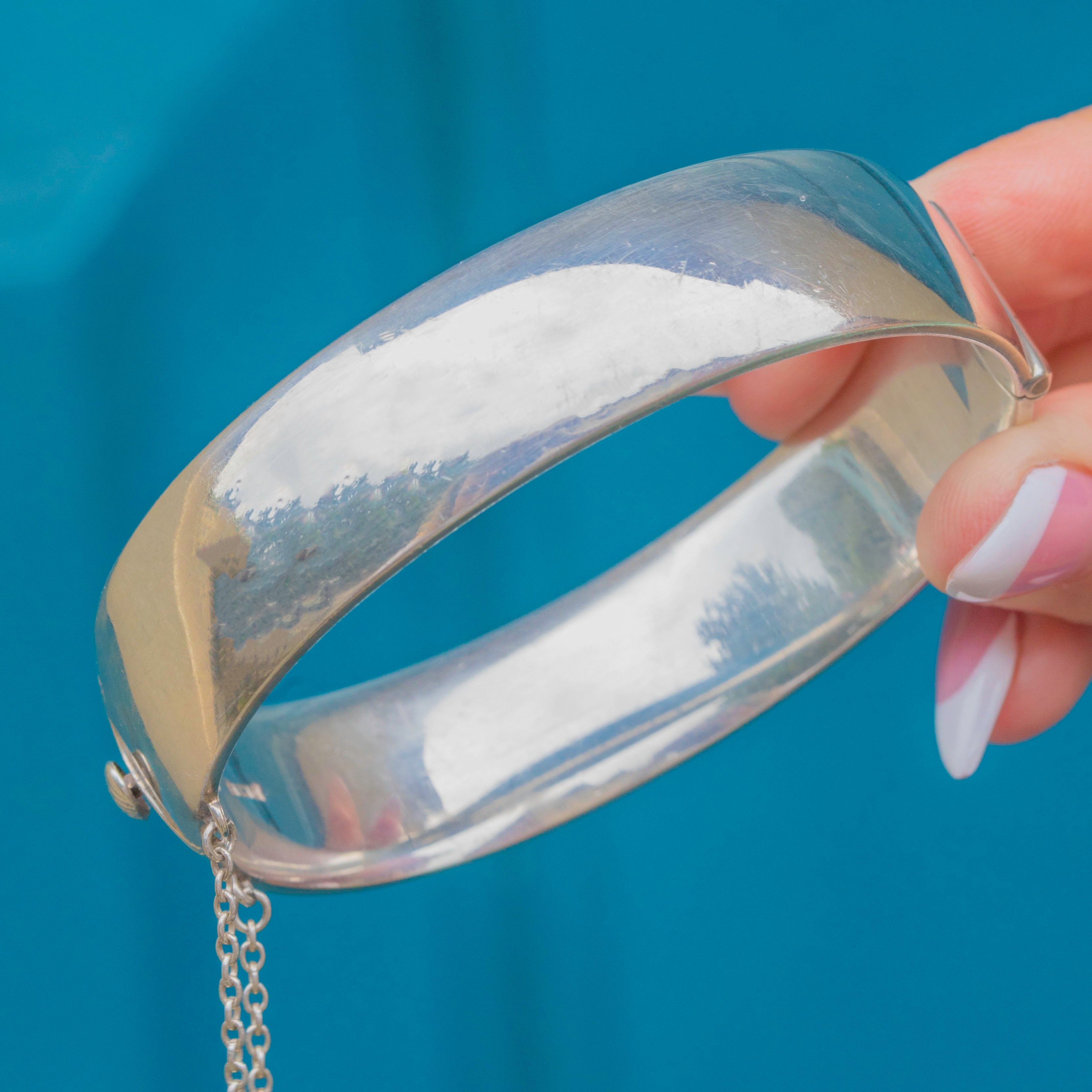 EXCELLENT: The Silver is bright and glossy and the Gold details are pristine. The bangle closes securely and has an added safety chain, so you can wear this mid-century cuff bangle with utmost confidence!