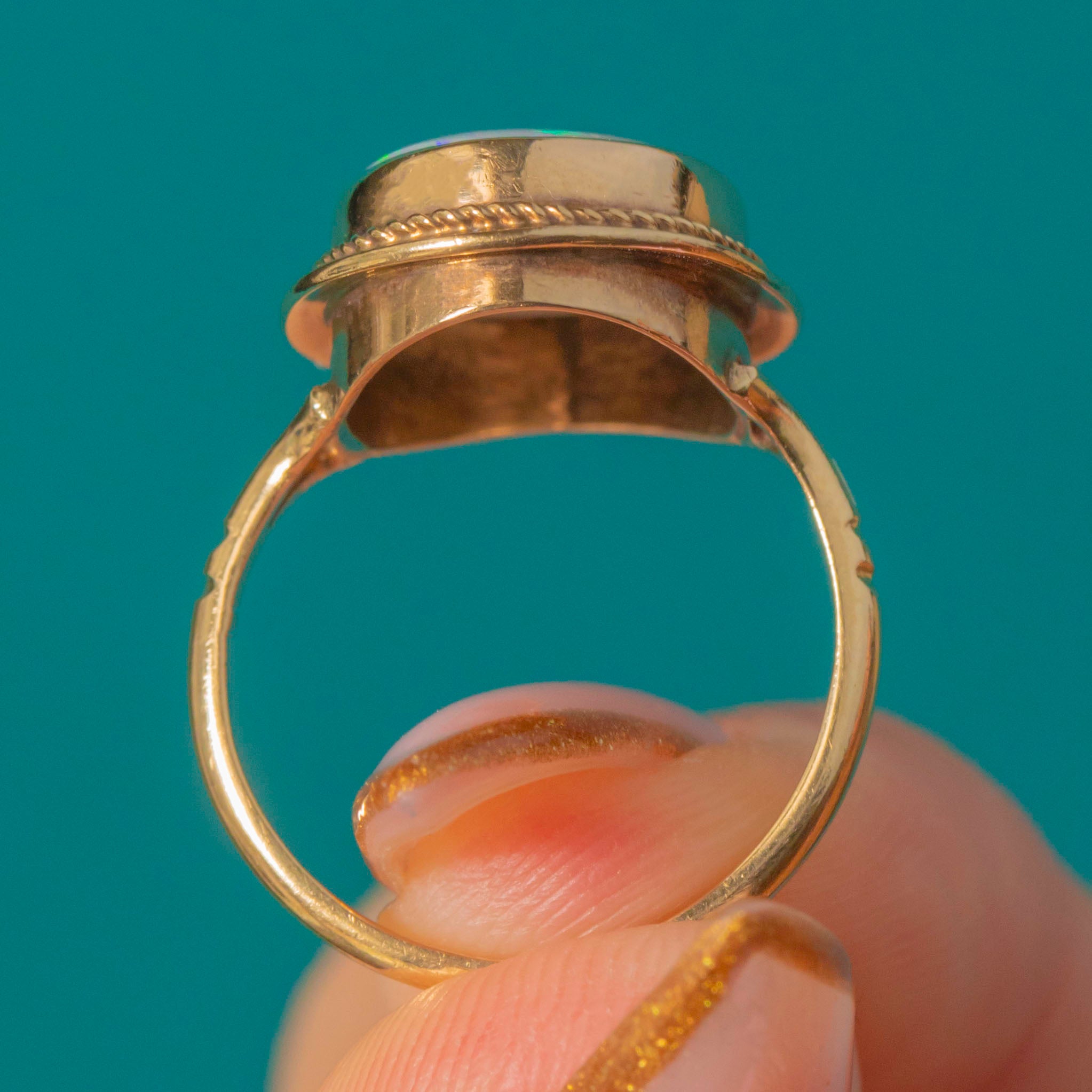 EXCELLENT: The Opal is natural, solid and displays vivid colour play across the surface with no cracks or abrasions visible. The 9ct Gold setting and band are robust and smooth, with clear, crisp English hallmarks dating the ring precisely to 1980.